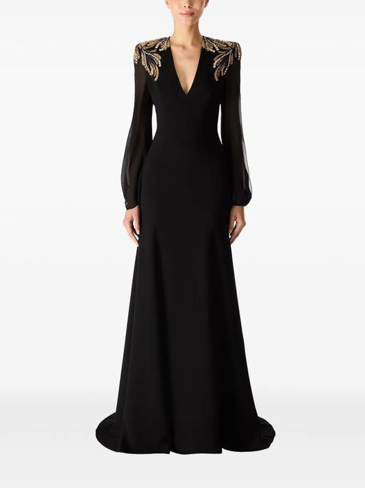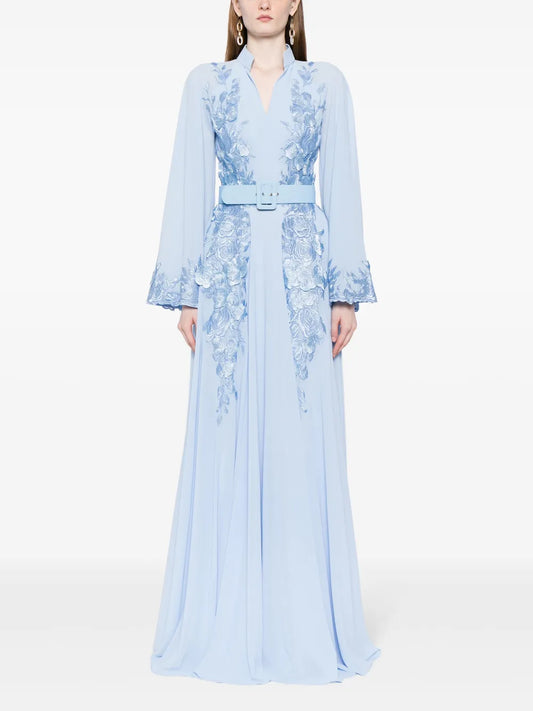 Floral-Embroidered Beaded Kaftan Dress
