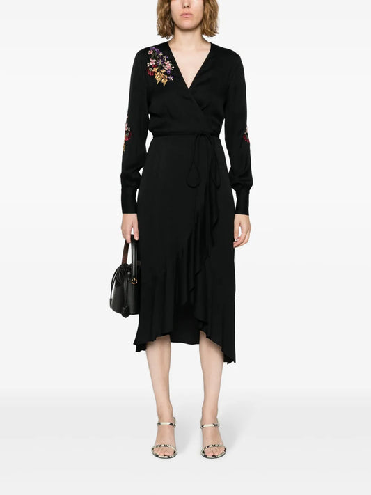 Floral-Embroidered Crepe Wrapdress