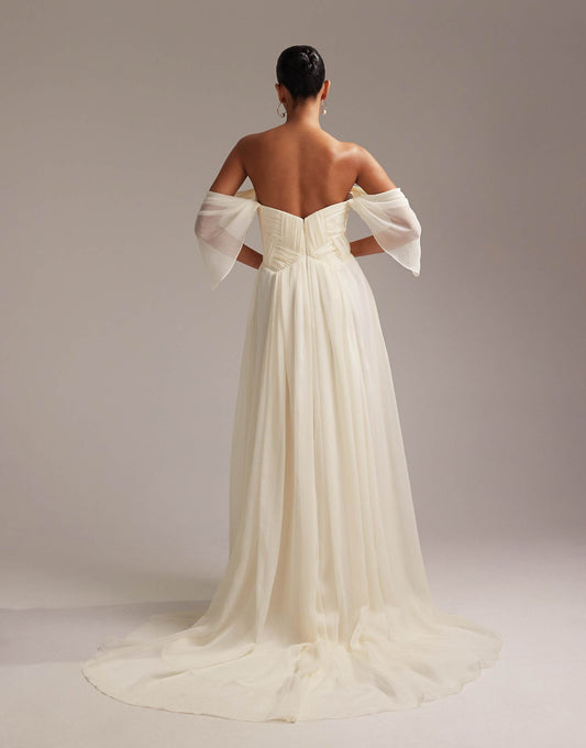 Curve Pleated Corset Maxi Wedding Dress With Draped Sleeves