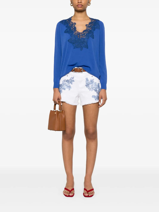 Lace-Appliqué Denim Shorts
